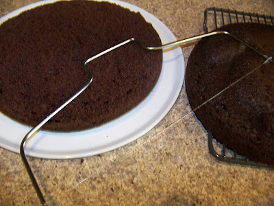 I like using this cake slicer because it makes the layers even.I made two different butter cream frosting for the cake one is a vanilla butter cream which I also added food coloring to, and the other is a chocolate butter cream. You can fine the recipes for the frosting's on my cooking blog Stefanie's Cooking Spot. I used the chocolate butter-cream between the layers and on the sides of the cake.